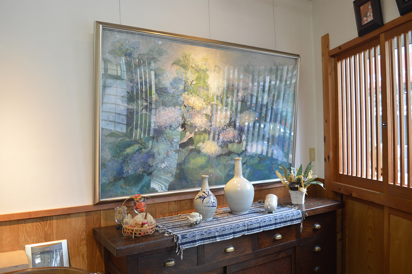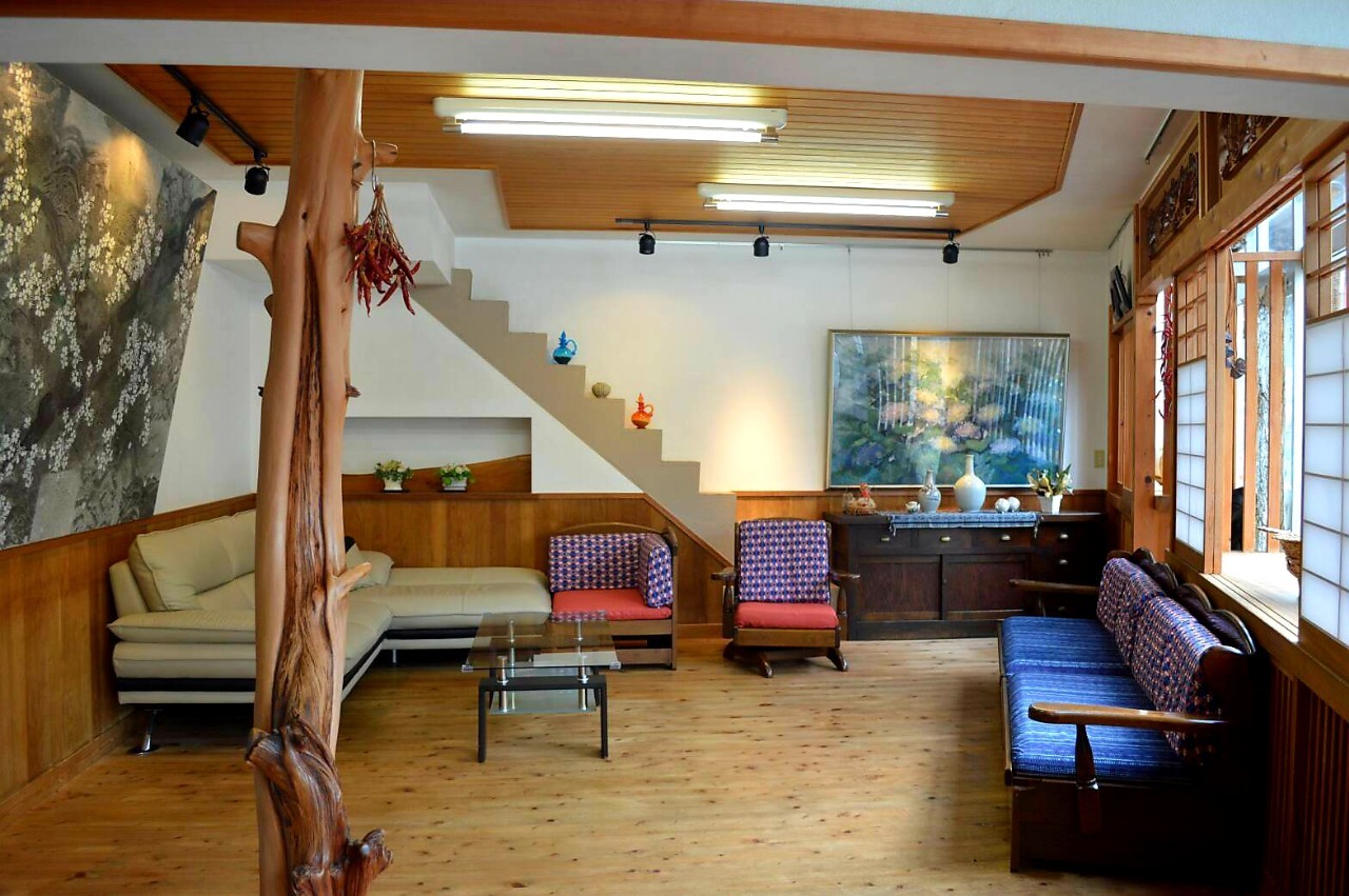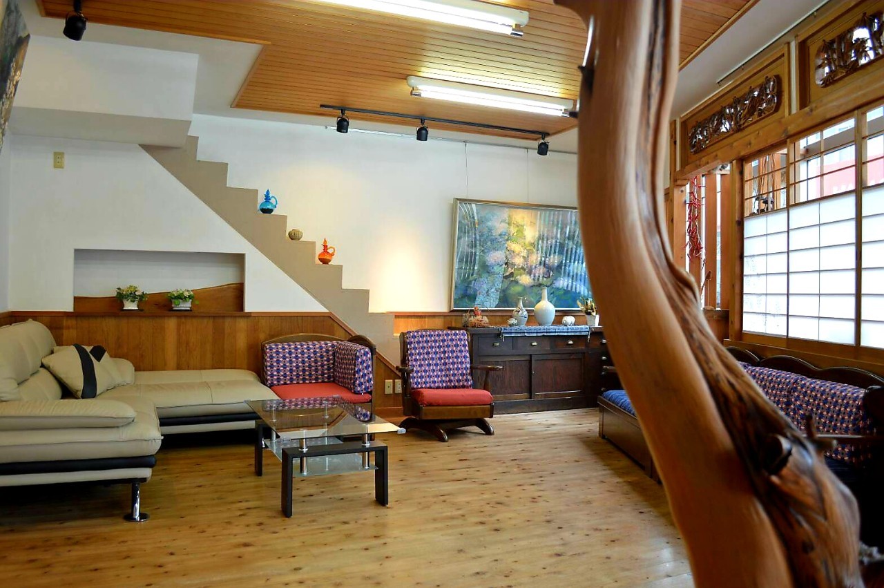 玄関の扉を開けると右手に純和風のロビー、美術館のようなしっとりとした雰囲気が、語らいの場の空気を和ませてくれます。荷物を置きになり、まずはこちらに腰をおろしてひと休みしてください。